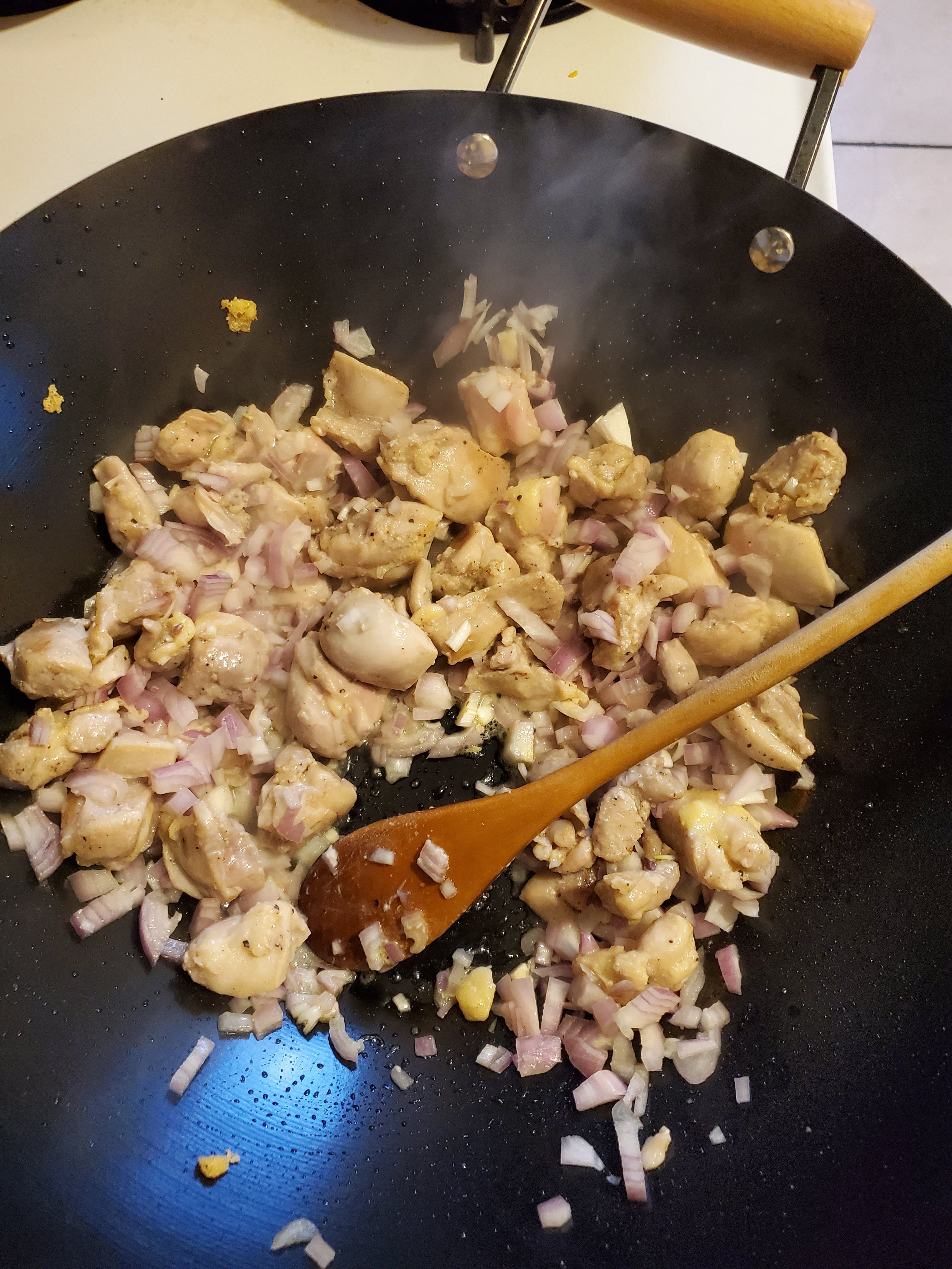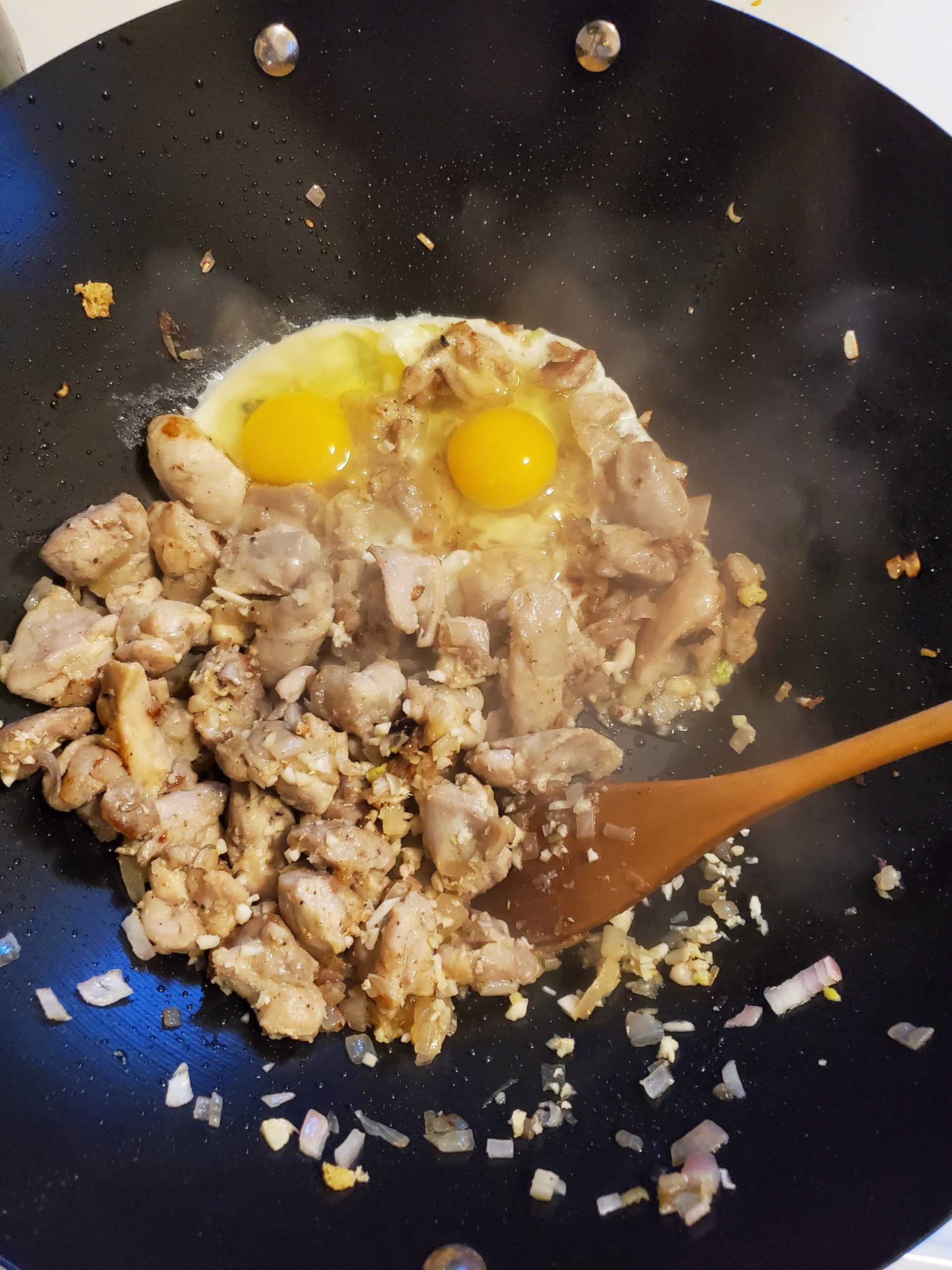 Heat a large pan or wok over high heat then add oil. If using tofu, fry it until lightly browned then remove and set aside. You might want to add some more oil afterwards then add the chicken and salt to taste. When chicken is almost completely cooked, add garlic and shallots and stir for about a minute. Move the chicken aside and add in eggs then stir them to scramble until cooked.