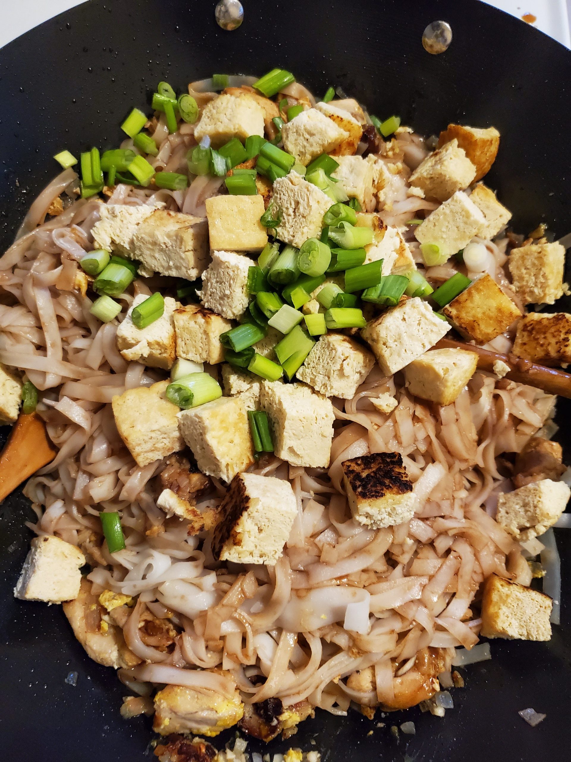 Add your cooked and strained rice noodles to the pan and stir. Then mix in the reduced sauce until everything is incorporated. Add the tofu, green onions and bean sprouts. Stir until evenly mixed then remove the pan from the heat. Serve with lime and crushed peanuts if desired, and enjoy!