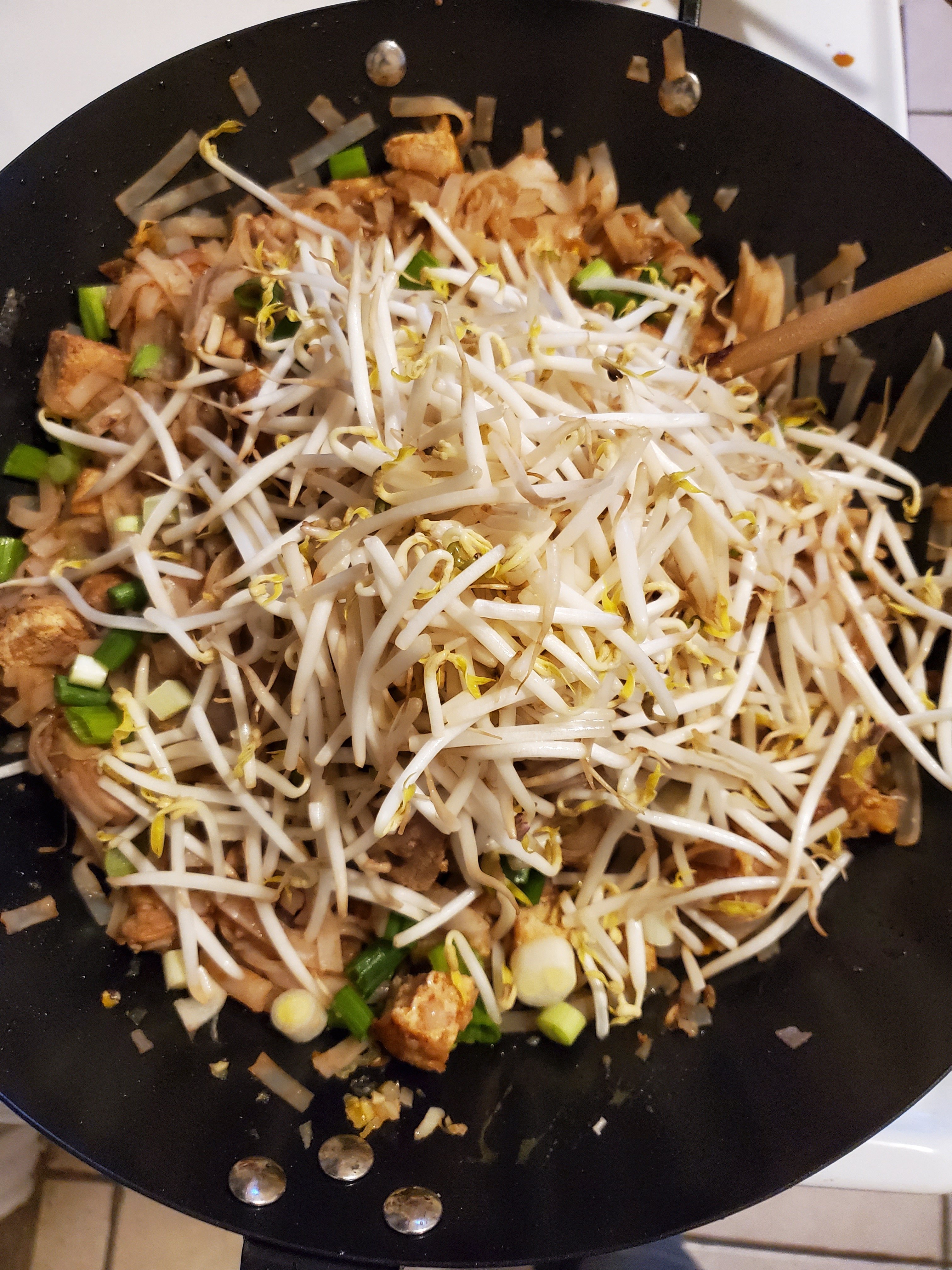 Either way, Pad Thai is actually pretty simple to make and though I have been too lazy in the past to go out and get fish sauce and tamarind paste, they weren’t hard to find once I looked for them. There are a lot of different flavors and textures in Pad Thai, yet they come together beautifully; the sweetness from the sugar and the sourness from the tamarind paste, the range from soft to firm from the noodles, tofu and chicken, then finally the crunch of the bean sprouts and the peanuts. So much deliciousness in one pan!
