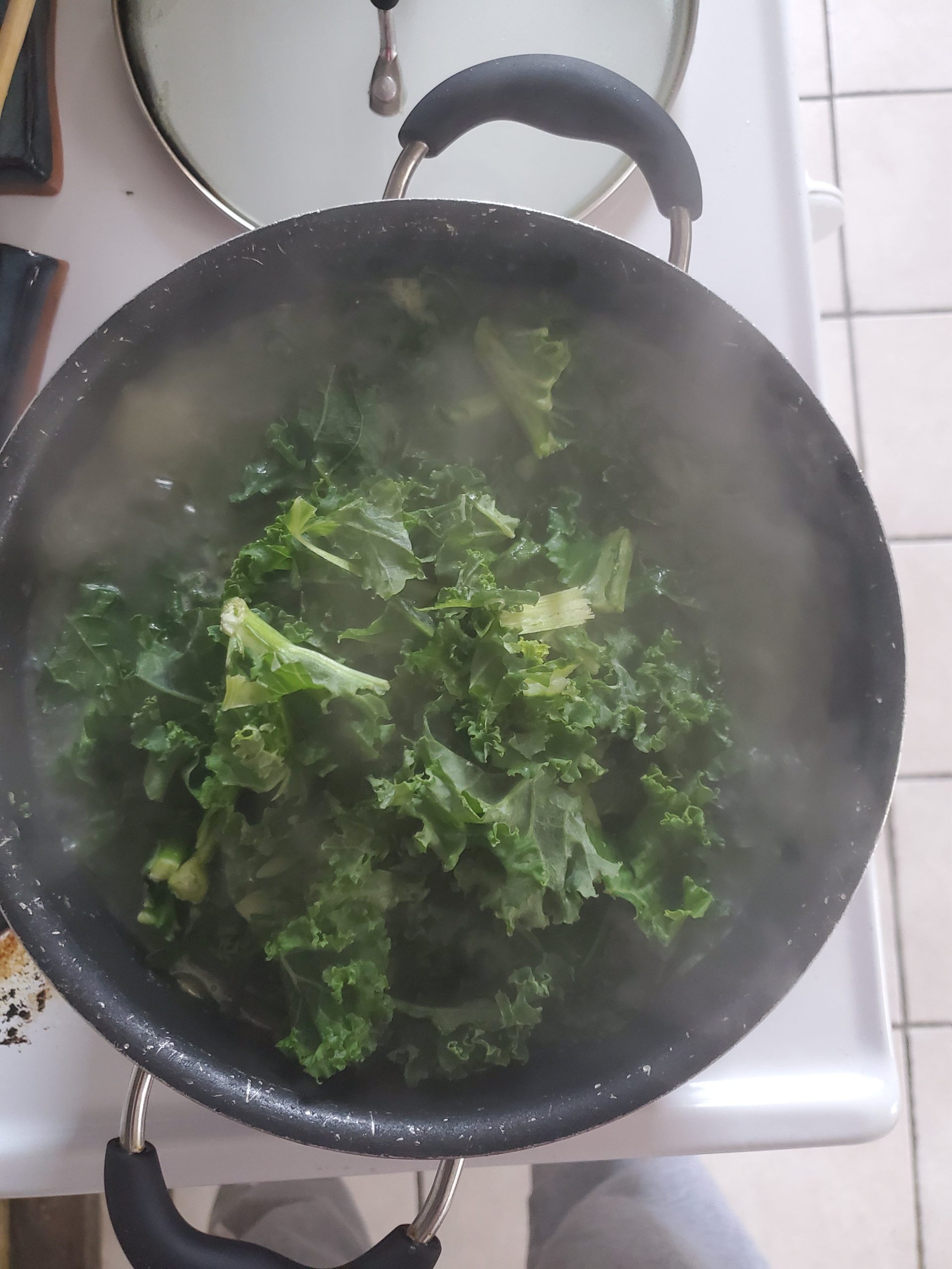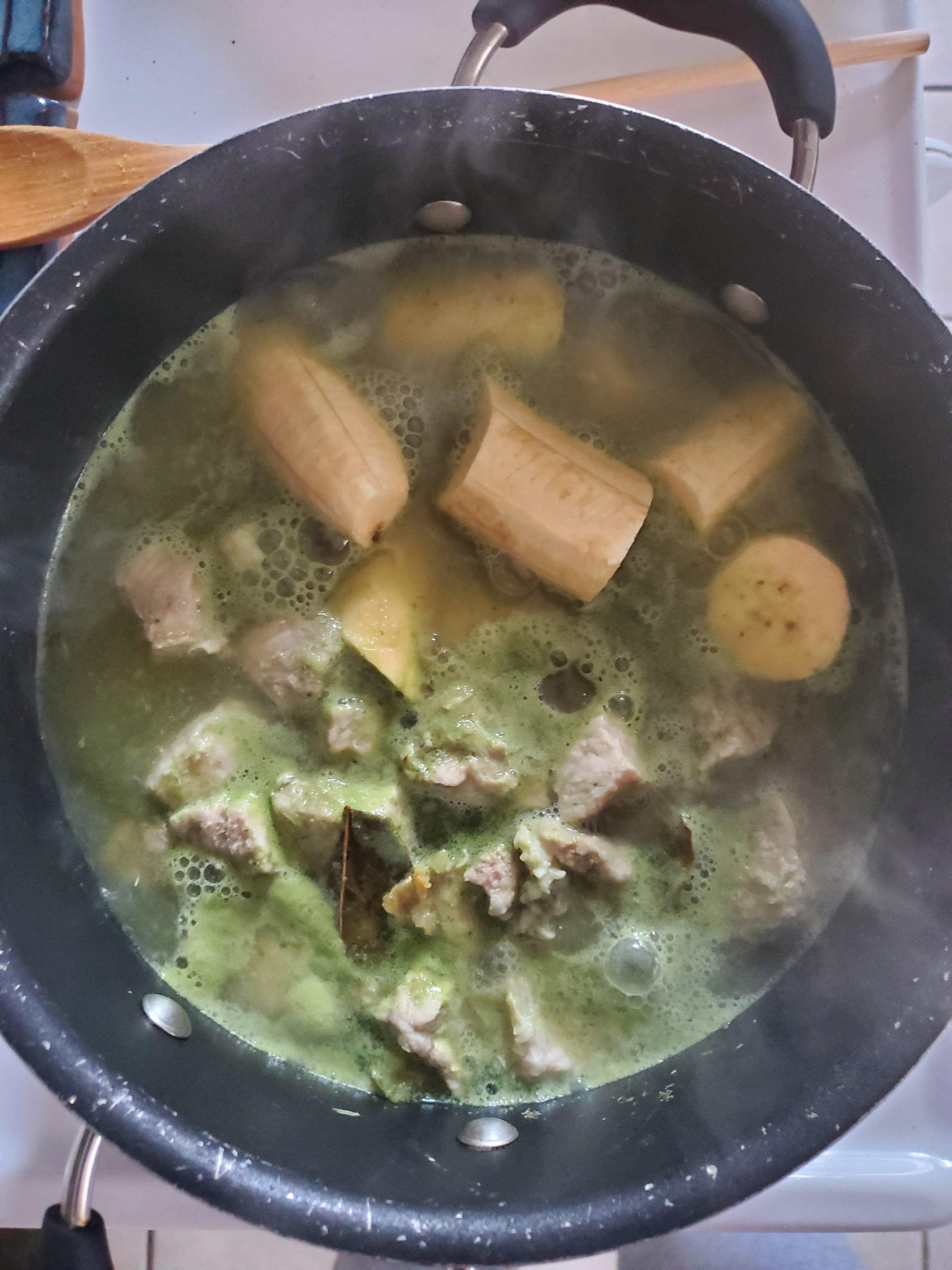 Peel and cut plantain into 3 to 4 pieces and add them to the pot. Let it boil for about 10 minutes then add kale. At this point you can also add more water or more seasoning if necessary. Let it boil for another 10 to 15 minutes or until the plantains are fully cooked and the kale has wilted. Take out the bay leaf and serve hot.